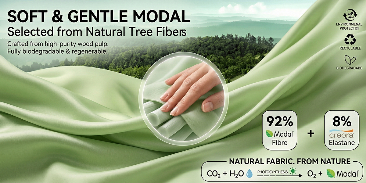 Modal is a bio-based fiber derived from natural wood pulp, known for its ultra-soft and breathable characteristics.