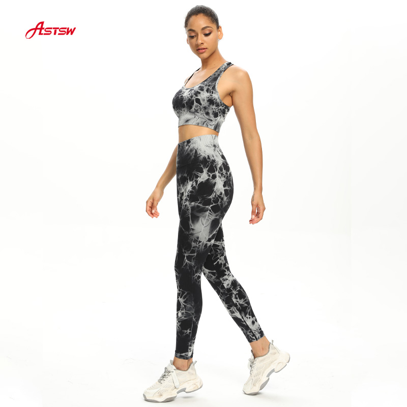 Collection de vêtements de sport sans couture. Ce soutien-gorge à dos nageur sans couture et ce legging taille haute présentent un motif tie-dye.